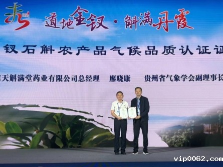 2023年5月,协助赤水市贵州赤水金钗石斛申报获得中国气象服务协会“气候好产品”认证,并为赤水信天斛满堂药业有限公司颁发金钗石斛农产品“气候品质认证”证书。山地特色农产品品质认证,有效助力特色优质农产品增值畅销,推进气象为农服务提质增效。