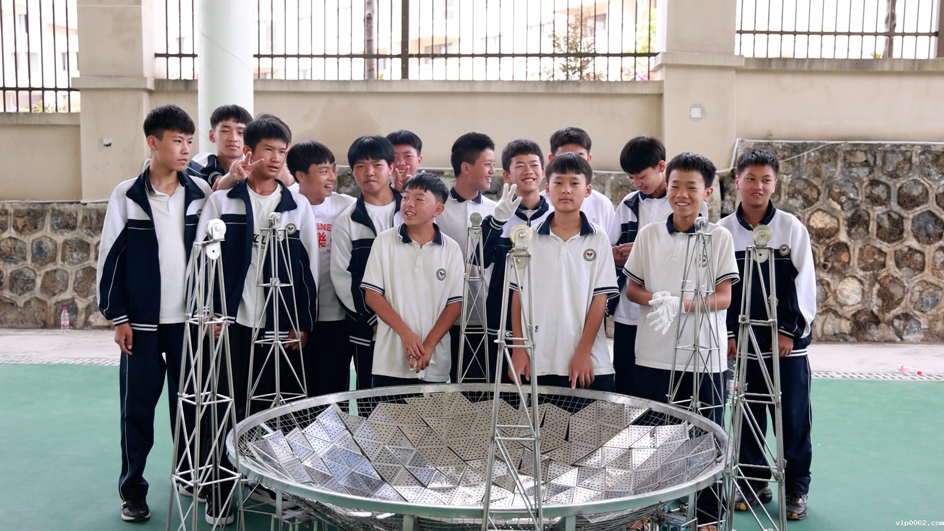 “搭建‘天眼’的时候,把我们六个复展支柱给等距离地排布,然后把我们这一口大锅给支撑起来……”