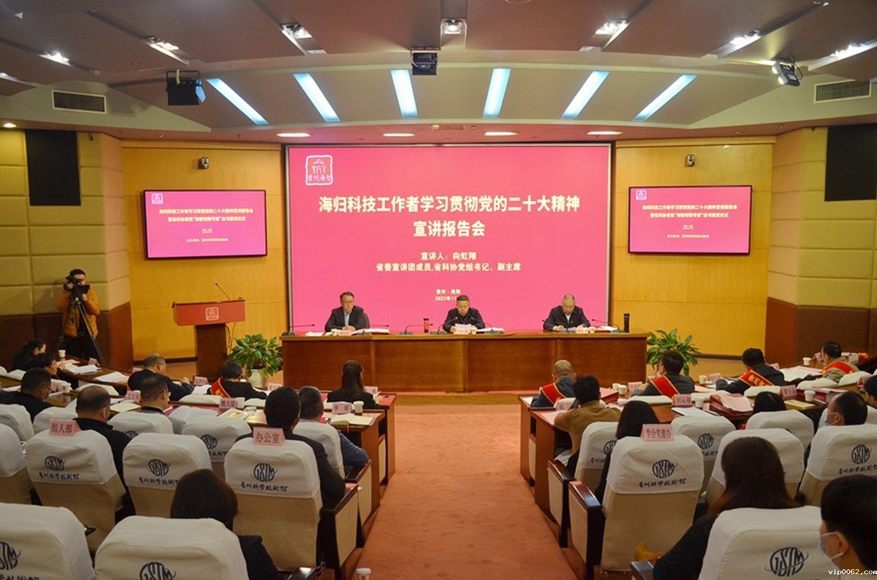 2022年11月17日,海归科技工作者学习贯彻党的二十大精神宣讲报告会暨点点taptapapp安装下载首批“海智特聘专家”证书颁发仪式在贵州省科技馆举行。省委宣讲团成员,点点taptapapp安装下载党组书记、副主席向虹翔为点点taptapapp安装下载首批海智特聘专家及海归科技工作者代表宣讲党的二十大精神。